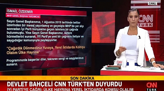 MHP Genel Başkanı Devlet Bahçeli, MHP Genel Başkan Yardımcısı İsmail Özdemir aracılığıyla CNN Türk Gece Görüşü programında İYİ Parti'ye yaptığı yerel Seçim mesajında şu ifadelere yer verildi: